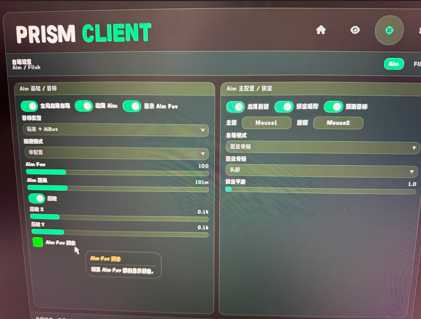 软件设置页面可以更改隐藏软件按键(只有在副机按才生效)软件功能自己调,看仔细,自瞄参数有一套参考