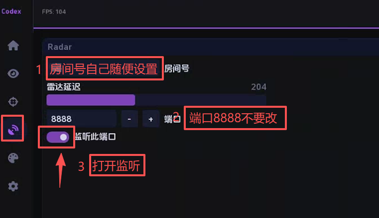 2、CODEX软件将雷达端口改成8888然后点击监听此端口、进入游戏